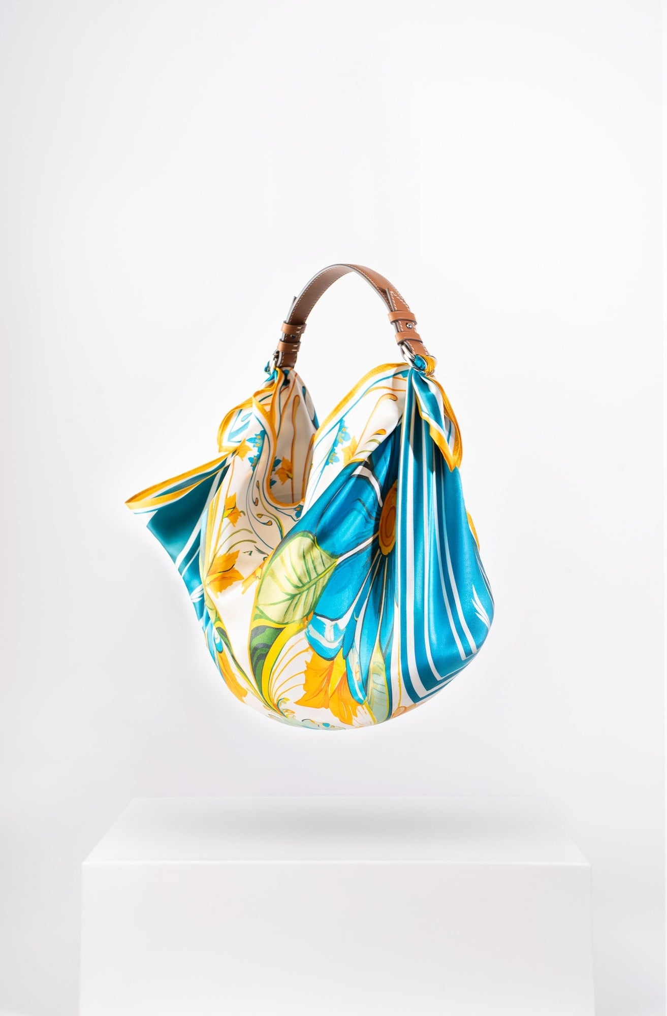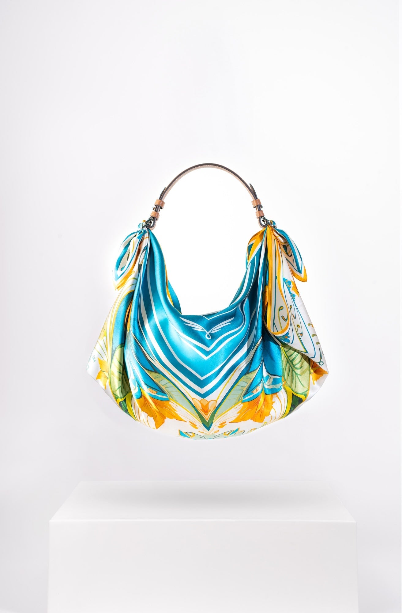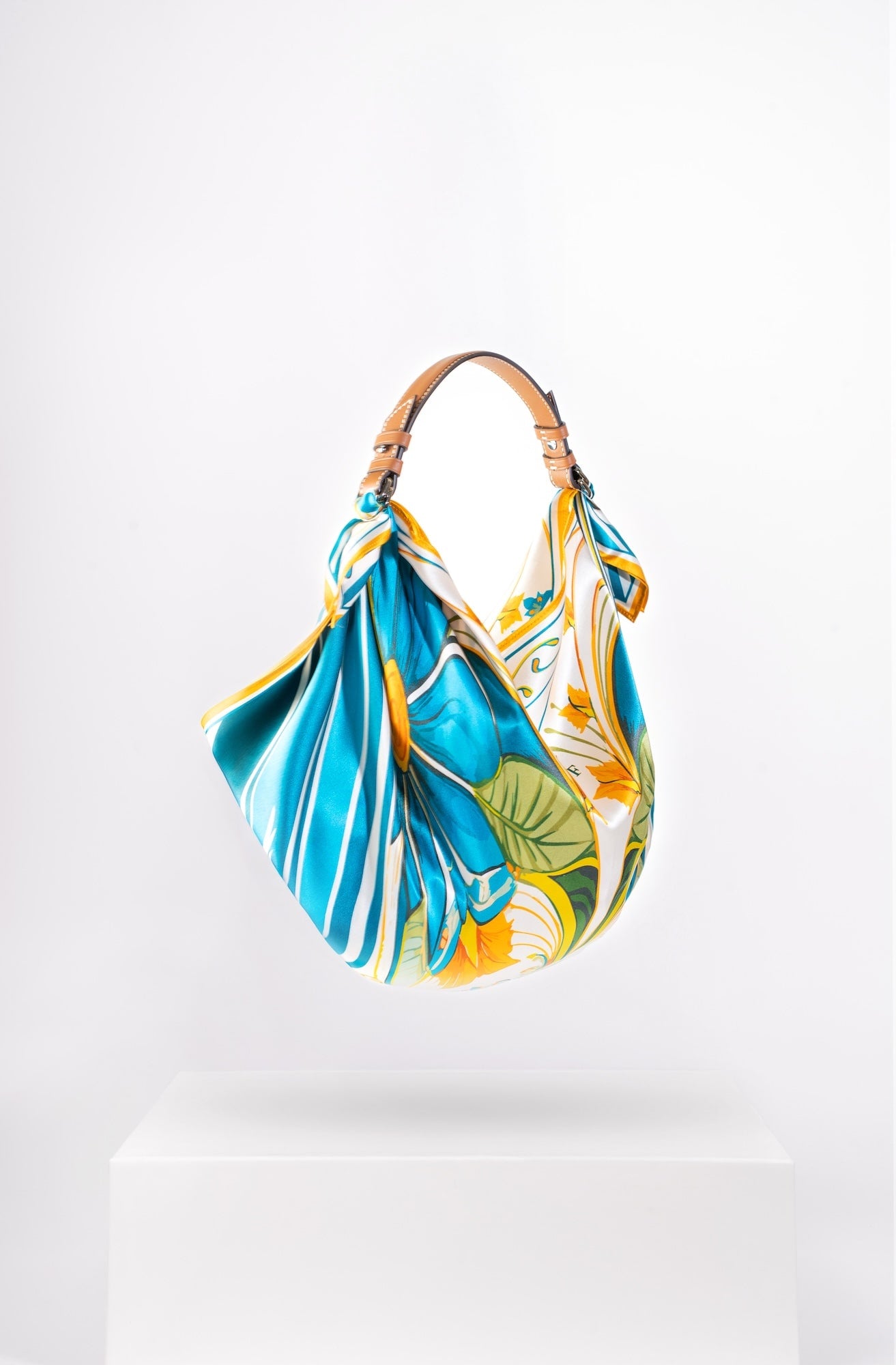 Il Giorno celebrates the radiance of daylight and a playful homage to Friday mornings spent buying fresh flowers at the market. Crafted from a 67 × 67 cm silk square, its vibrant print is knotted onto a structured tan-leather handle, creating a bag that’s as light-hearted as it is luxurious. From market strolls to midday lunches, it carries your essentials with effortless charm and joy.