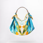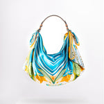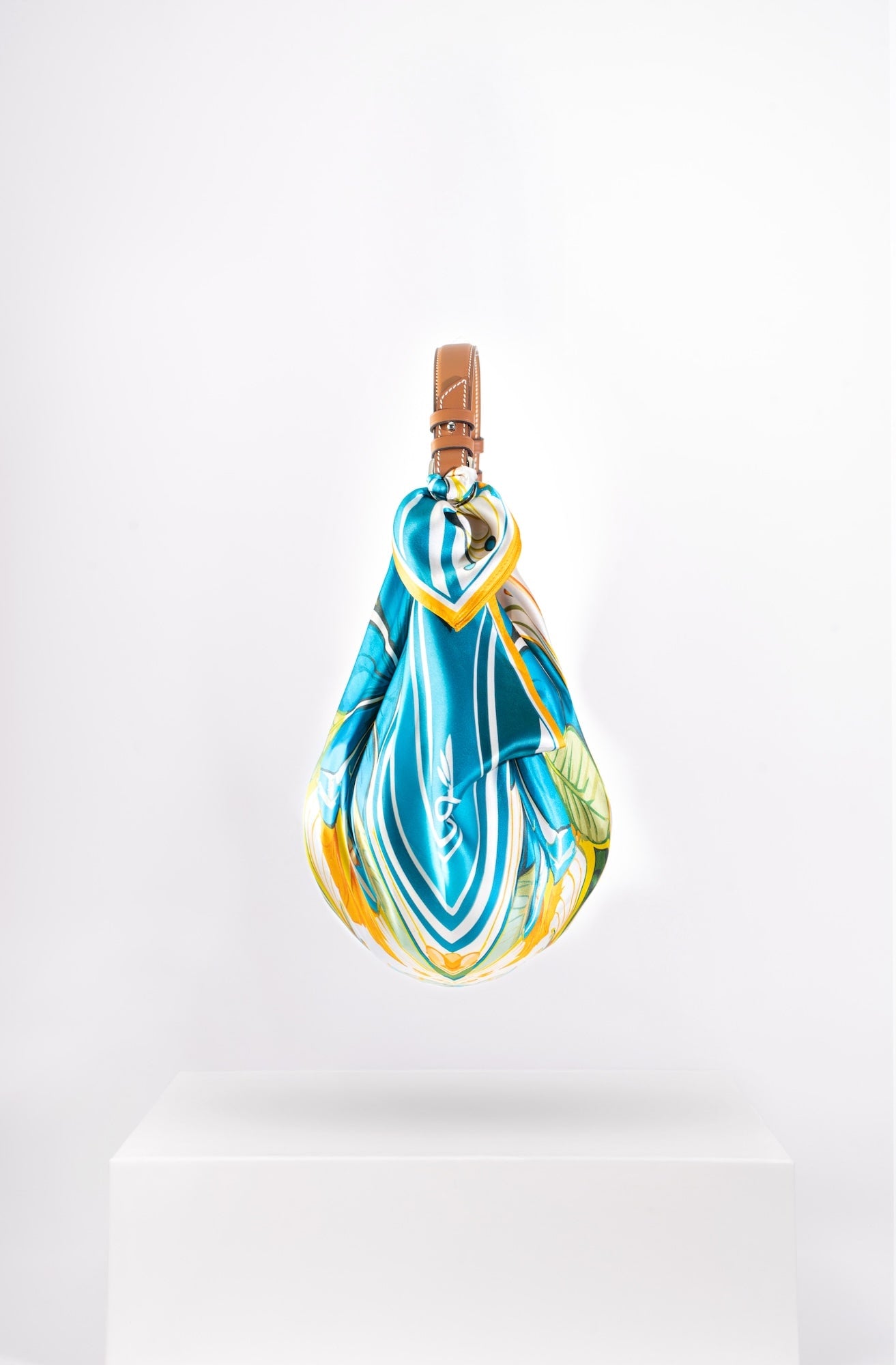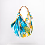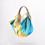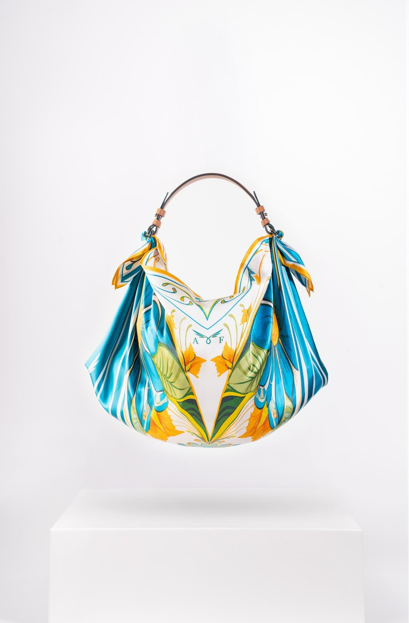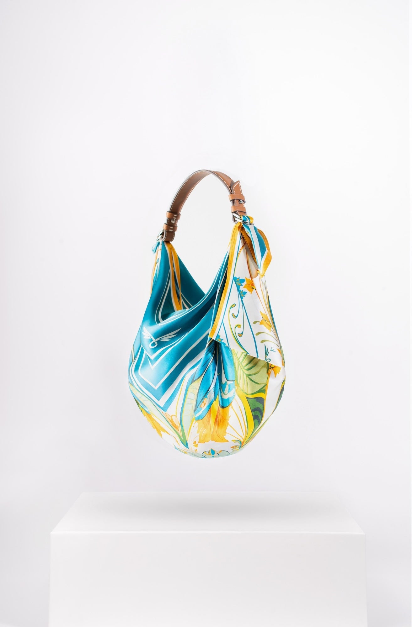 Il Giorno celebrates the radiance of daylight and a playful homage to Friday mornings spent buying fresh flowers at the market. Crafted from a 67 × 67 cm silk square, its vibrant print is knotted onto a structured tan-leather handle, creating a bag that’s as light-hearted as it is luxurious. From market strolls to midday lunches, it carries your essentials with effortless charm and joy.