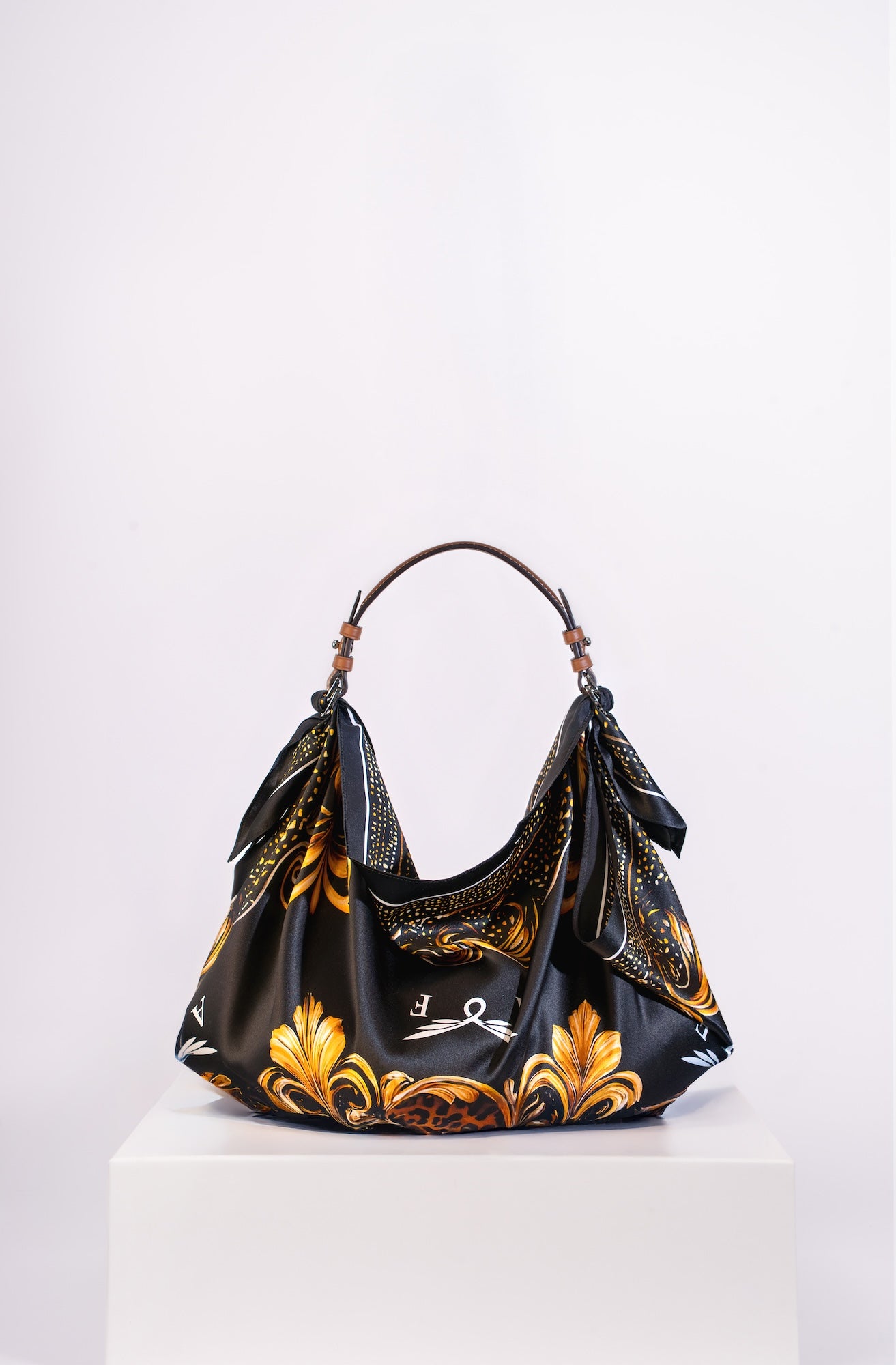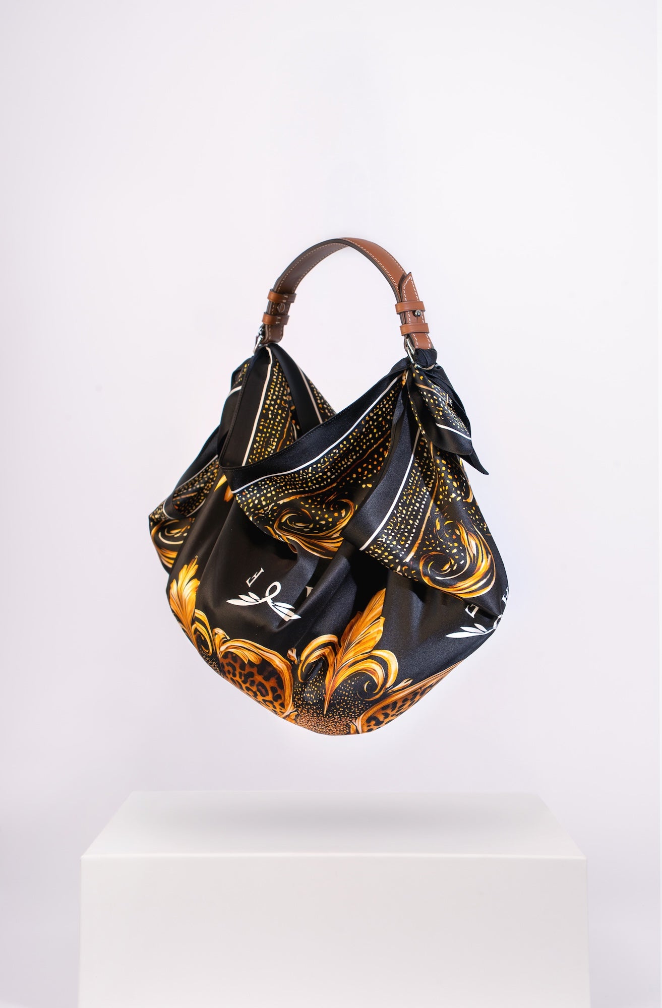 - Black silk scarf with golden leopard motifs and baroque inspired motifs