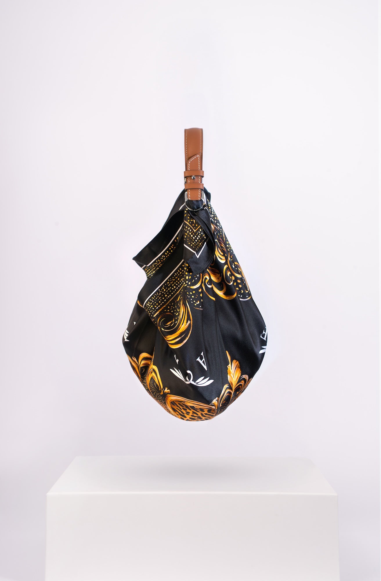 La Notte is inspired by the sensual shift of Italian summer evenings — when golden light fades and a silk scarf becomes a statement. Crafted from a 67 × 67 cm silk square knotted onto a structured tan leather handle. From the beach to dinner, it carries your essentials with effortless sensuality.