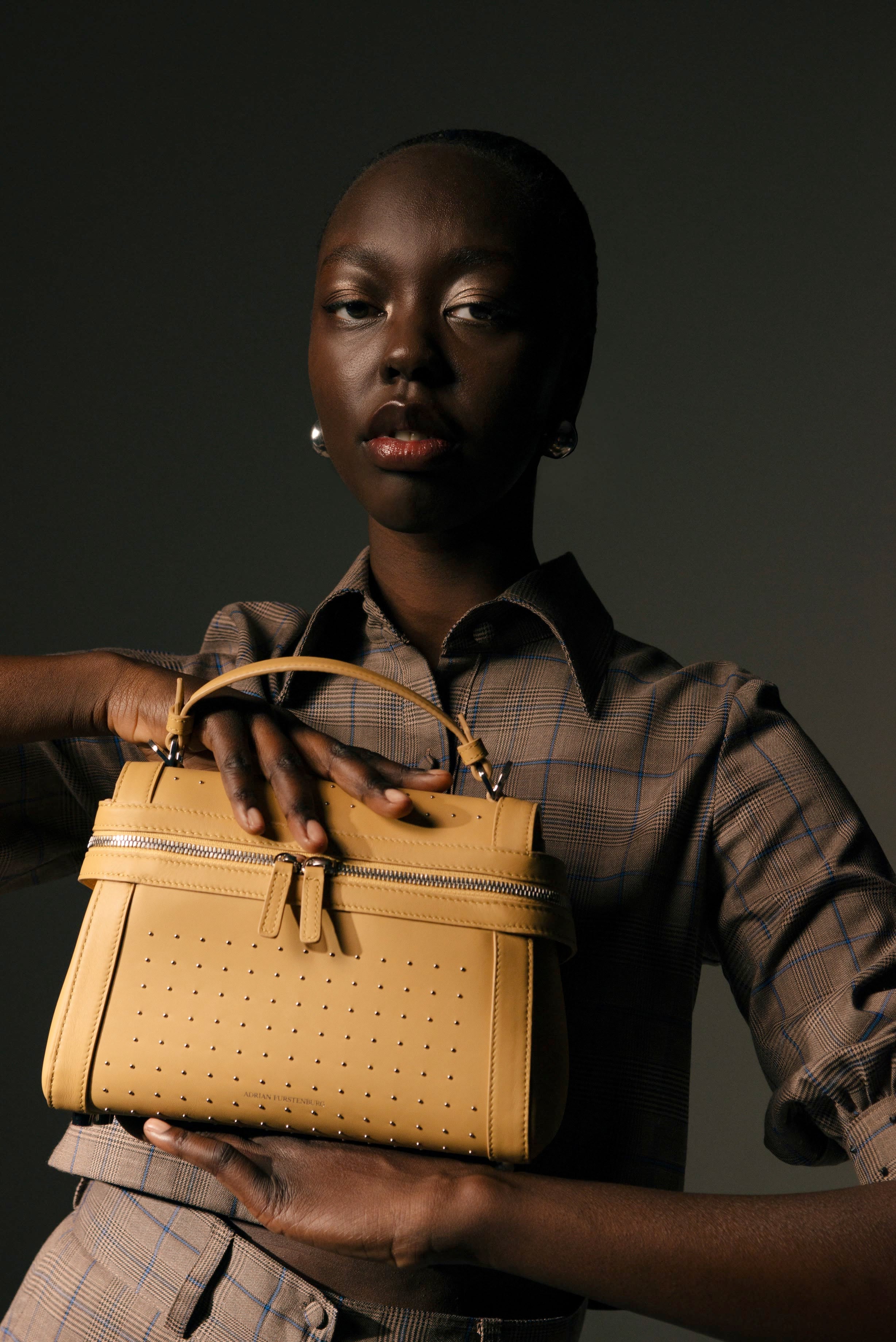 Shown here in smooth sand dune colour, full-grain leather, with a top handle and adorned with delicate silver studs. The double zipper offers added security, opening to a spacious interior with two compartments, two zip pockets, a cardholder, and an AirTag holder. Solidly placed on our signature base with eight protective studs.